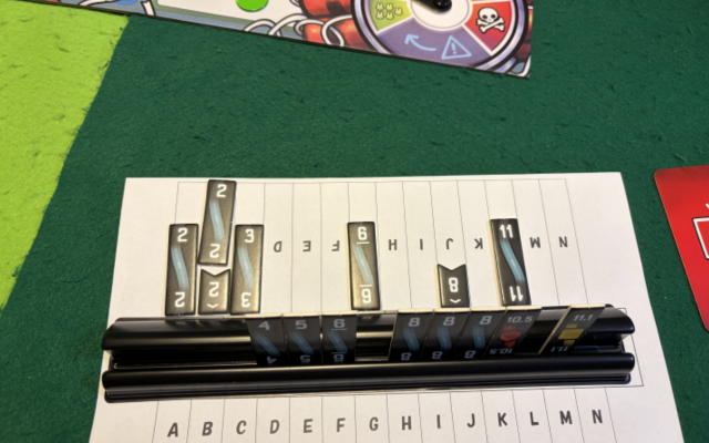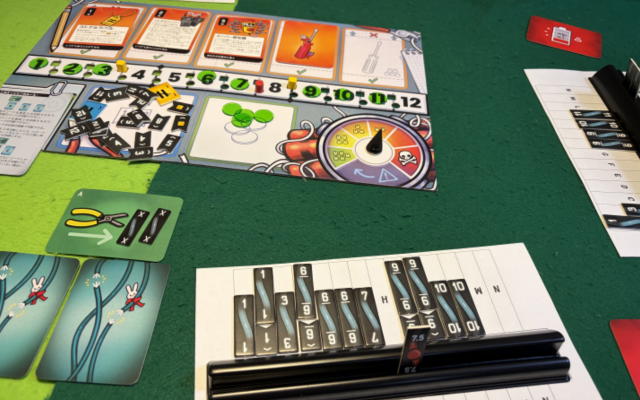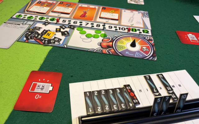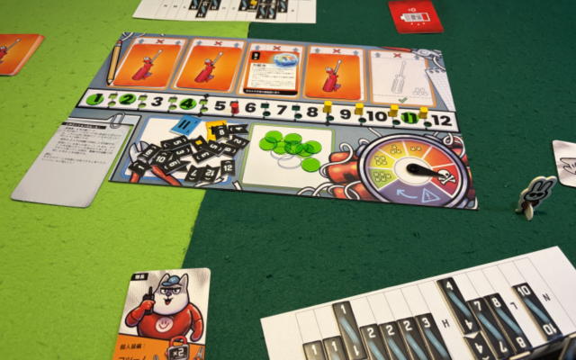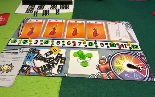 手番には、自分の持っている数字タイルの中で、相手の1枚を示して「これ、6でしょ」みたいに質問する。もしそれが合っていれば、お互いのタイルを外に出す。間違っていれば、爆弾ゲージが1段階進み、その数字のヒントタイルを置く。