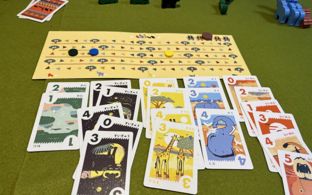 動物1種類全てのカードがでるというところがポイントで、自分が得点を稼ぎたい動物は0とか1とか昇順に並べていくのだ。
