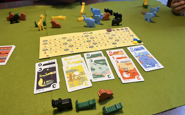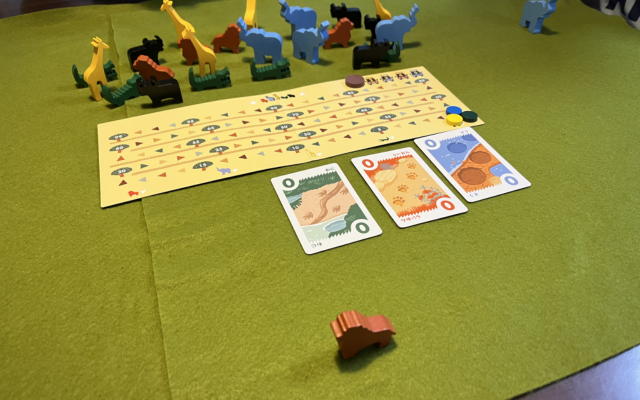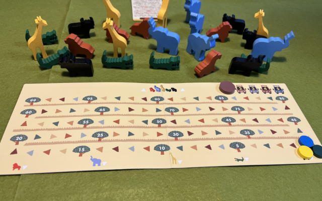 手番はカードを動物の列に1枚出して、好きな動物駒(カードと違うのでも良い)を1個取るだけ。