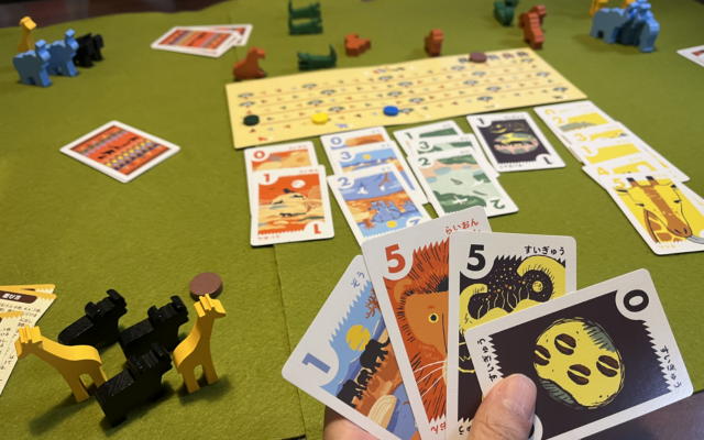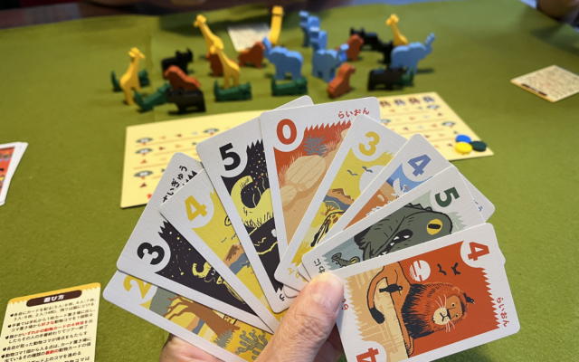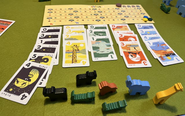 0〜5の動物カードがあり、それに対応したそれぞれ5匹の動物駒がある。
