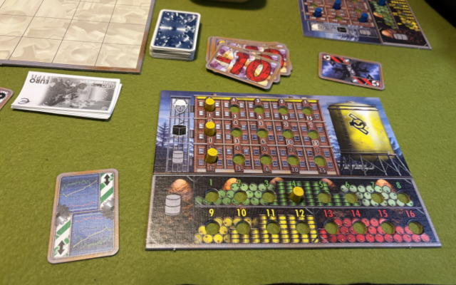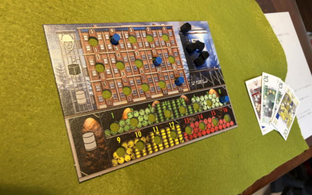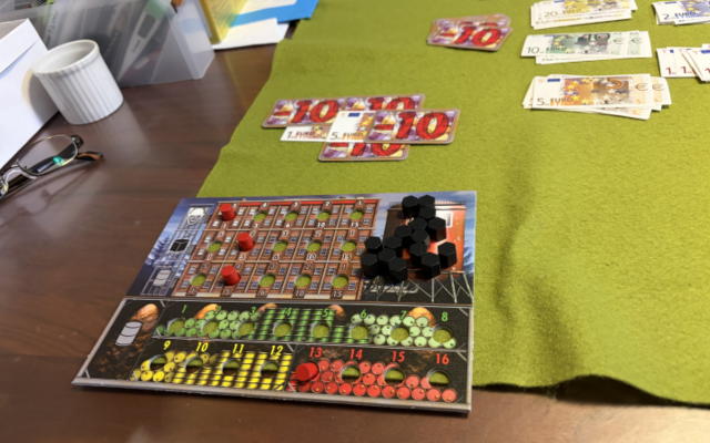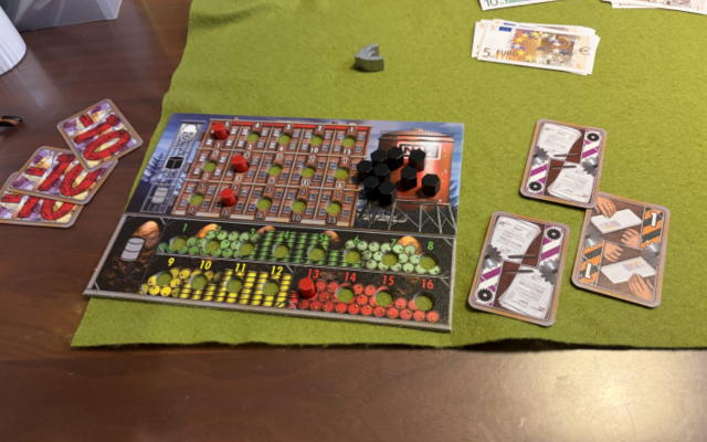 前に生産しないけど、原材料で儲けるというこのやり方で勝ったこともある。このゲーム、タイトルにマネーとついてるように、ドイツゲームとしては珍しくお金の勝利点割合が高いのだ。