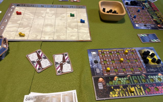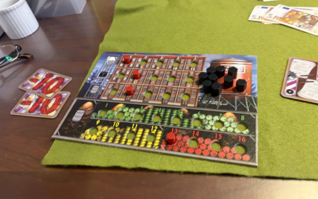 個人ボードには、効率化度合い3項目(合理化、必要原材料、廃棄物)と廃棄物倉庫マスがある。原材料を手に入れたらそれもこちらに置く。