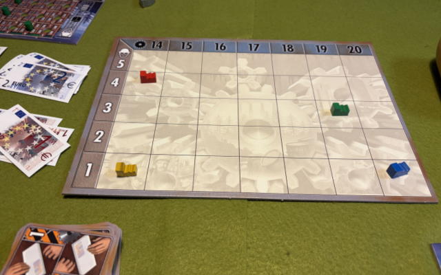 共通ボードは左上からスタートし、右にいくほど会社が成長していく。上下は社員数である。最初が14からスタートしているのはこれは商品を作った時に得られる金額と最後の勝利点を表しているからだ。社員数も同様で、5(つまり500人を表す)は、人件費5Mをも表している。このようにユーザーフレンドリーなボードとなっている。