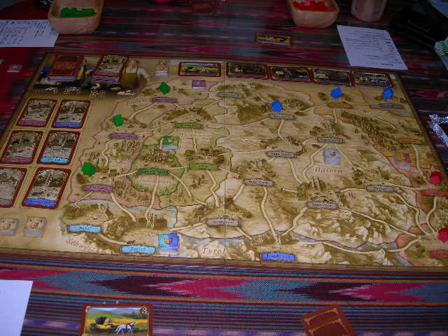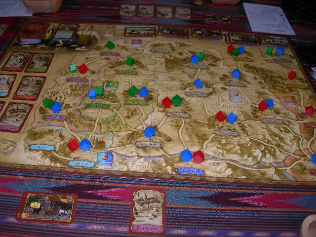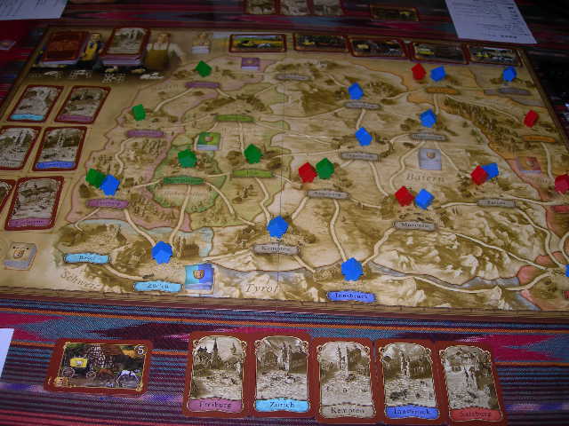 バイエルン地方狙いの青に対して、周辺都市を攻める緑。青、非常に上手くいき、優勢。下に並べてあるのが郵便網で、左右の端に繋がるように置いて行かなければならない。今、5つの郵便網を完成宣言したところ。左に置いてある5の郵便網のボーナスカードを手にした。
