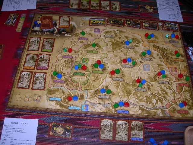 各地でおもろいと評判になり、2006年ゲーム大賞にノミネートされた。しかも作者はあのプエルトリコの作者、ザイファルトである。TAM夫妻との3人プレイにて。